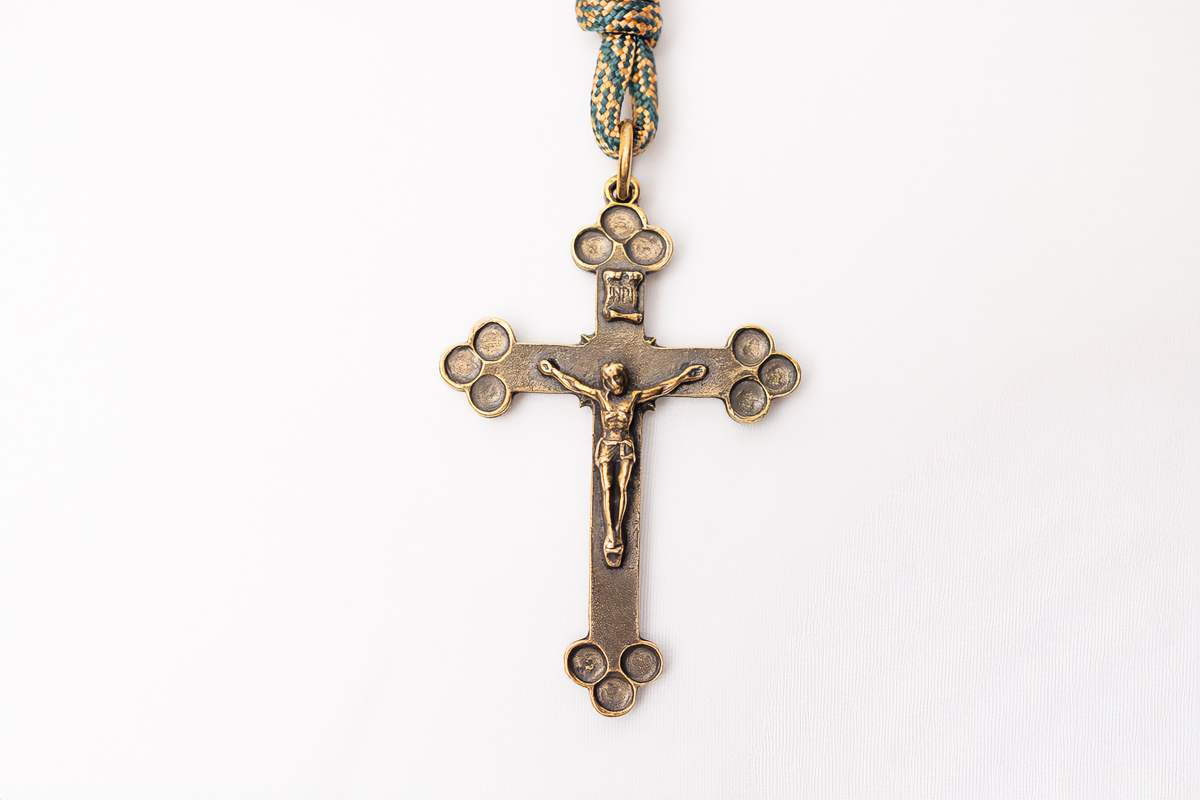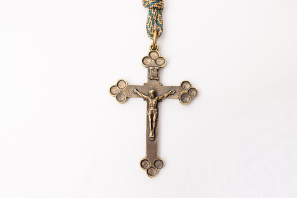 – krzyż zamontowany w różańcu jest tradycyjnym krzyżem, bez jakichkolwiek ozdób, cały odlewany, wys. 6,5cm